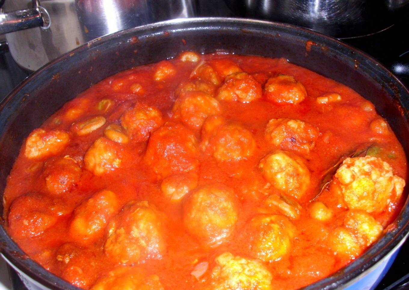 - Vamos haciendo las albóndigas rebozamos a y a la cacerola donde ya tenemos la salsa de tomate hecha, añadimos las habas y los guisantes, listo. Lo servimos acompañado de unas patatas fritas o solo con la salsa de tomate.